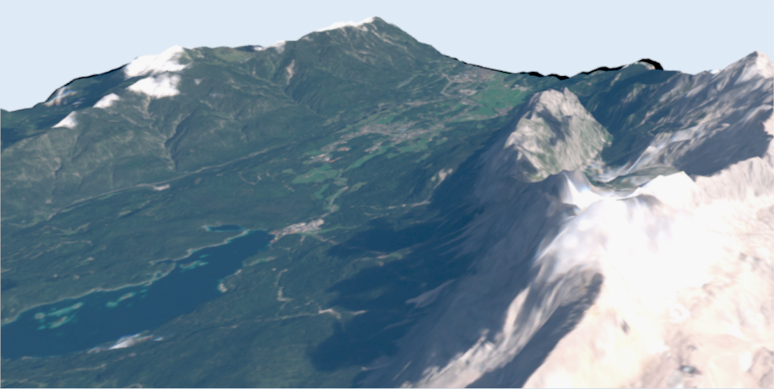 Ready for a fun fact? We can construct entirely new coverages, cell-by-cell. We want to do this, for example, to support WebGL clients in doing 3D terrain draping. The trick is to provide a PNG image where RGB is built from some any source (like a satellite image) while feeding the alpha channel with the elevation data. Of course we will need to adjust resolution as both typically differ widely; we choose to re-scale the DEM. This is what the corresponding query looks like: