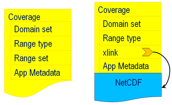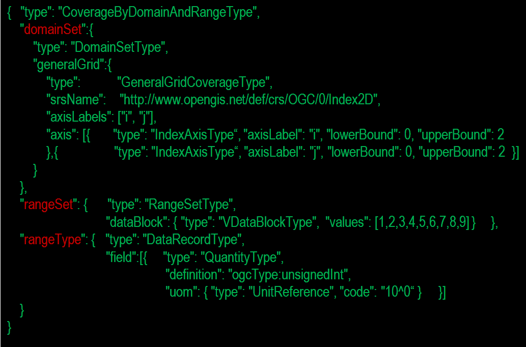 The coverage structure is represented 1:1 in the XML, JSON, and RDF encodings coming with CIS 1.1. However, while these encodings are "informationally complete" in that they carry all of a coverage's information they are not always inefficient. For 1-D diagrams formats like JSON are ideal because the file will be small anyway, and can be consumed conveniently by some JavaScript or TypeScript client and its diagramming libraries. A satellite scene, on the other hand, nobody would want to store and exchange in one monolithic XML file.